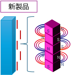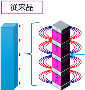 従来品は一点でしか強磁力を発揮できず、わずかなズレで性能が低下。